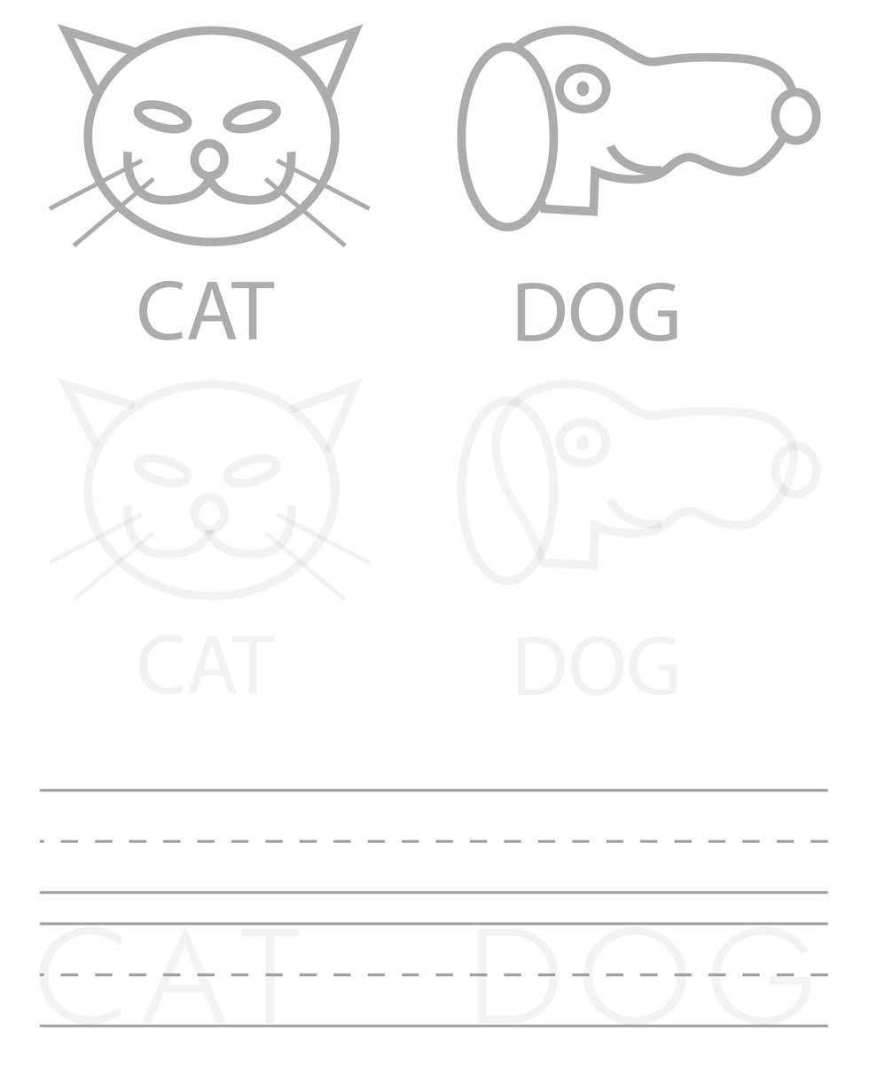 Below is a version of the worksheet with the outline of cat and dog art lightly shown in the drawing area to allow a young child to trace the image as practice before moving on to the regular worksheet (above) which allows them to draw the faces of cat and dog in freehand.